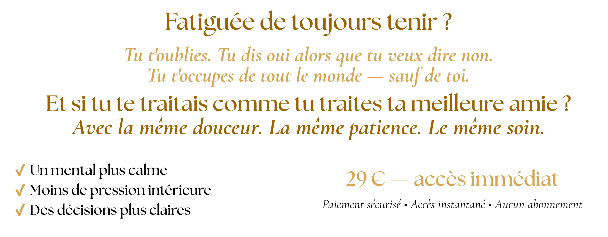 Ce programme a été un vrai déclic. La méditation incluse est devenue mon rituel quotidien et l’ebook m’a permis de poser des mots sur des émotions que je n’arrivais pas à canaliser. Après 3 semaines, je me sens beaucoup plus alignée et à l’écoute de mes besoins. J’ai compris que “non” n’est pas un gros mot, et ça fait du bien!! Un grand merci pour ce bel outil de reconnexion.